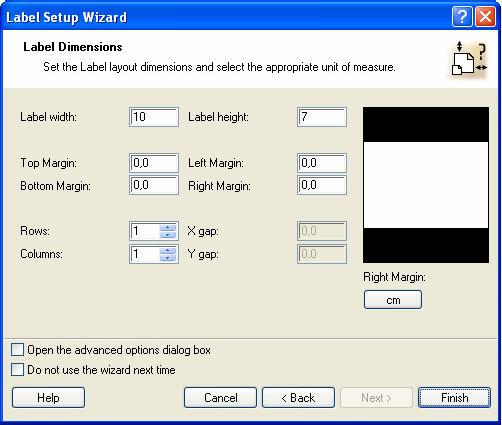 2. Click on the Next button. A new window opens to define the label dimensions manually.