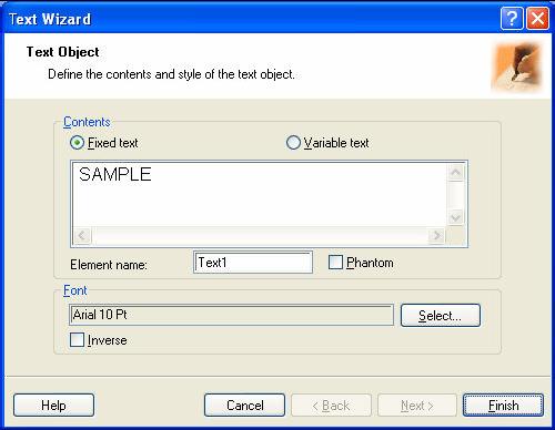 2. Move the cursor to the location on the label where you want to place the text object and click on the mouse. The dialog box with object properties opens.