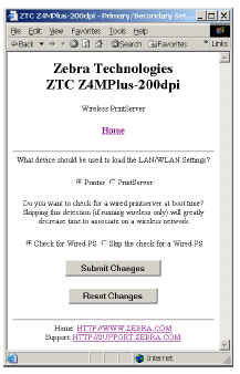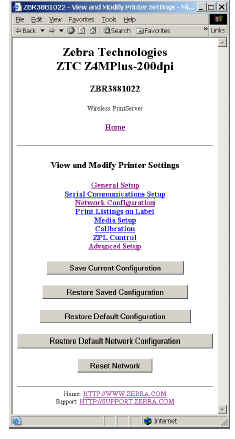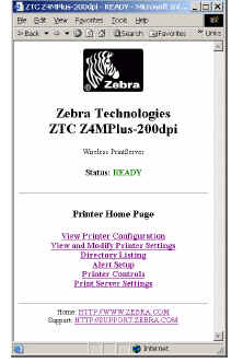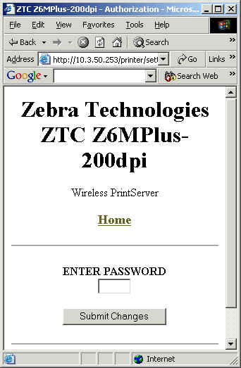 New Pages available through WebView in Firmware V60.x.x. WebView has some changes to the way a web browser session is authenticated and there are some new network related pages. Details: You can use the printer’s ZebraLink WebView web pages to view and modify many of the same parameters that appear on the printer’s front panel. Through the printer’s home page, you can also enter additional WEP encryption keys and change other parameters that are not accessible in other ways. In order to view settings and make changes you must first authenticate to the Printer via a password. The default password is 1234. To start, enter your ZebraNet Wireless Print Server's IP address in a web browser.