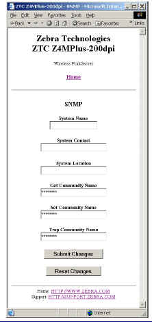 Note: For the Skip the check for Wired PS, if the Printer is set for Parallel Communications - Unidirectional or the ZebraNet Wired Print Server has Bi-Directional Communications disabled the Wired Print Server can still send jobs to the printer. SNMP - Here you can make changes to SNMP Settings.