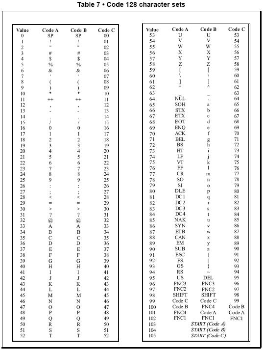 The table below shows the Code 128 Invocation Codes and Start Characters for the three subsets.